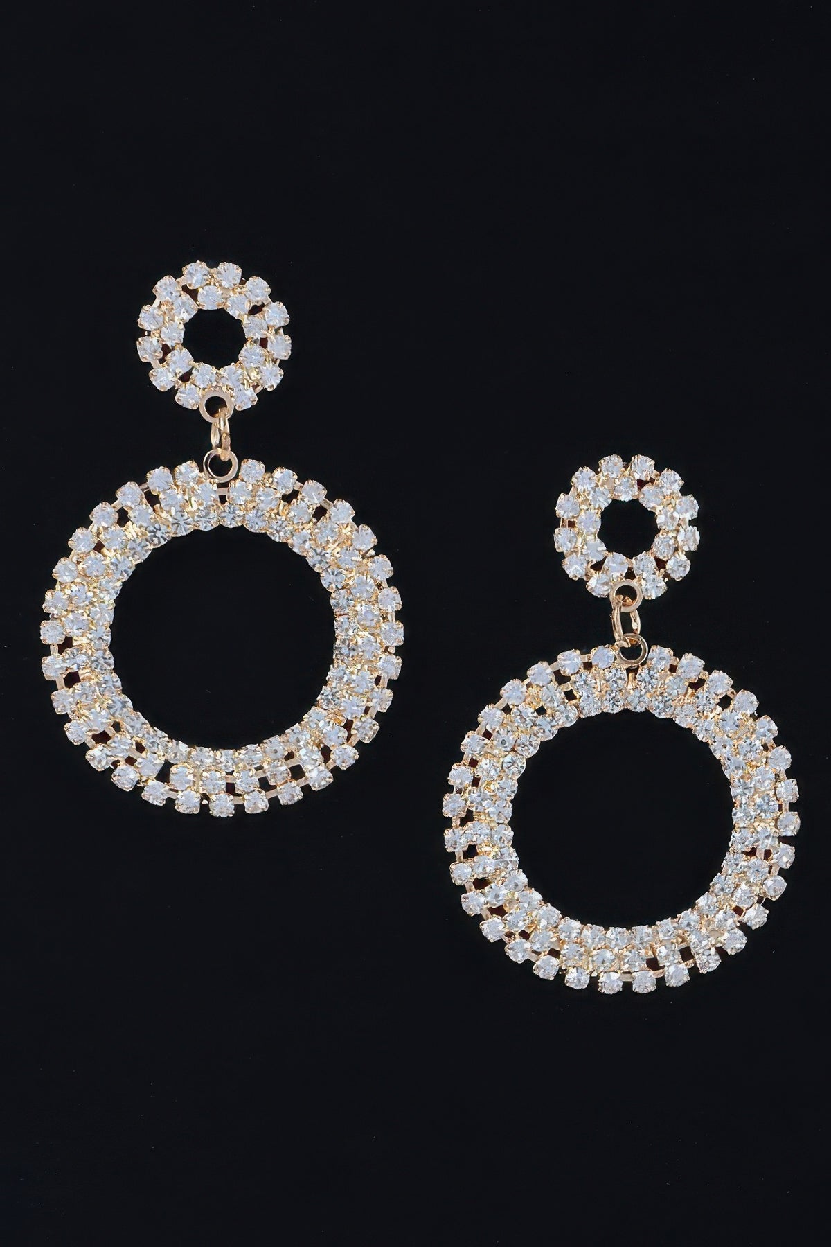 Each earring showcases a round circle design, adorned with shimmering rhinestones that are expertly placed to create a dazzling effect. The dangling feature adds movement and allure, drawing attention to your face and enhancing your overall appearance. These earrings are not only stylish but also lightweight, ensuring comfort throughout the day.