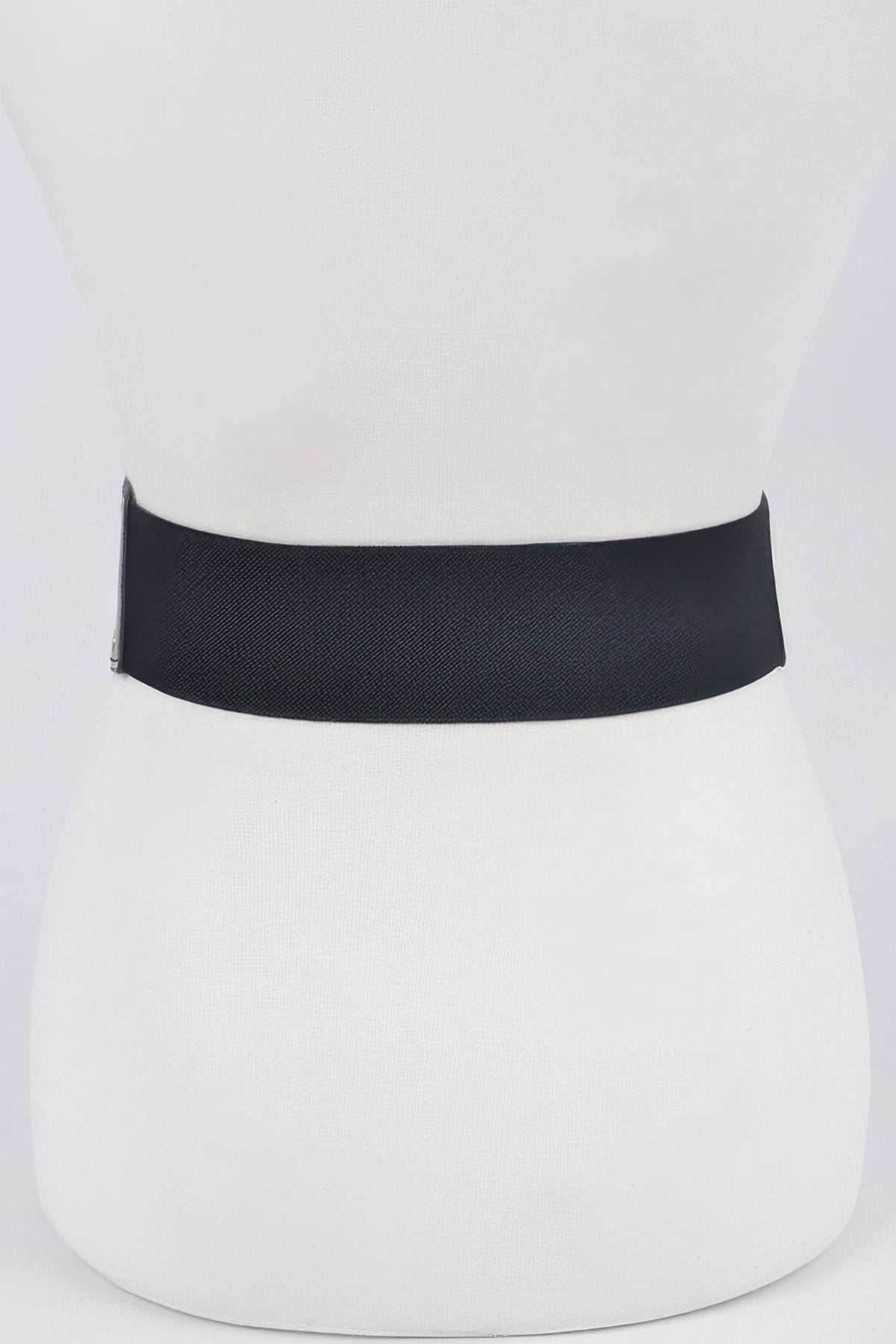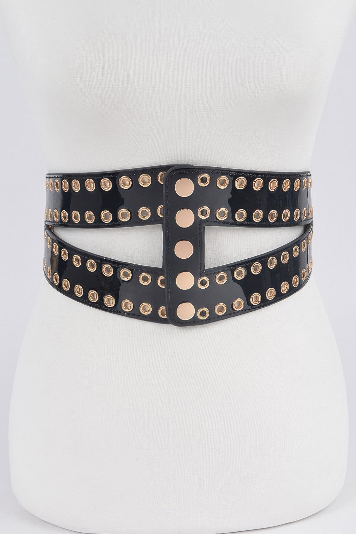 Define your silhouette with confidence in the Corset Stretch Belt with Eyelet, a bold accessory that blends edgy detail with structured style. Featuring a wide 5" design, this black belt is adorned with striking eyelet studs and a statement buckle that instantly elevates any outfit. Crafted from a blend of PU, elastic, and iron, it offers both flexibility and durability for a snug, flattering fit. Whether layered over dresses, tunics, or blazers, this corset-style belt brings drama and definition to your look.
