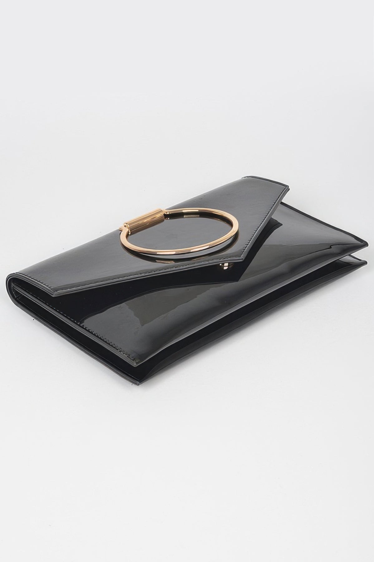 Chic and contemporary, the Enamel Faux Leather Metal Handle Flap Clutch is the ultimate accessory for polished evenings out. Crafted from glossy faux leather, this sleek clutch features an envelope-style flap and a bold metal ring handle that doubles as a striking design detail and practical grip. A detachable chain strap allows for hands-free styling when needed. With its structured silhouette and modern finish, this piece brings an elevated edge to both formal and cocktail attire. Designed to balance fashion-forward aesthetics with everyday functionality, it’s a must-have for your evening collection.
