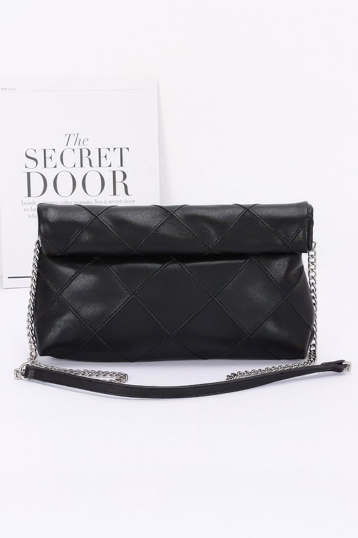 Features a chic chain strap and playful secret door sign detail