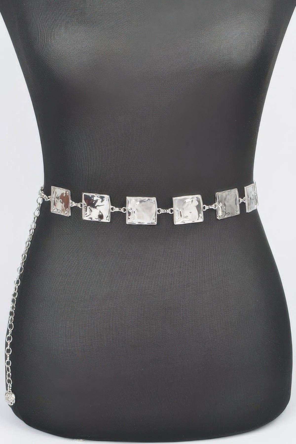 Elevate your outfit with the Hammered Square Metal Chain Belt, a striking accessory that brings a bold, textured touch to any ensemble. Made with durable iron and designed with hammered square metal links, this belt is perfect for adding an edgy flair while cinching your waist.