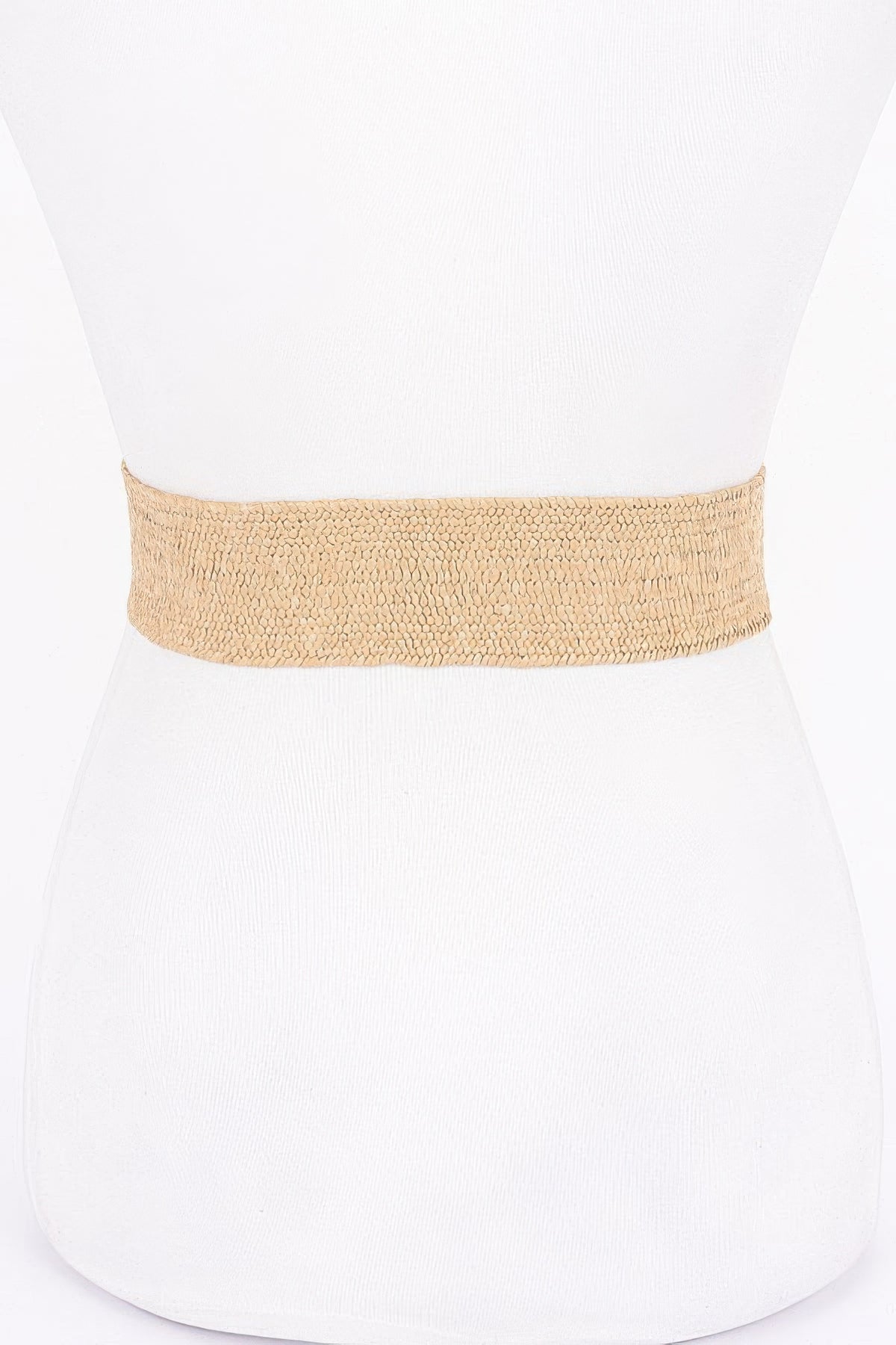 Design: Features a distinctive metal buckle and a faux straw texture, adding a natural yet modern vibe to your look. The elastic construction ensures comfort while maintaining a sleek silhouette.