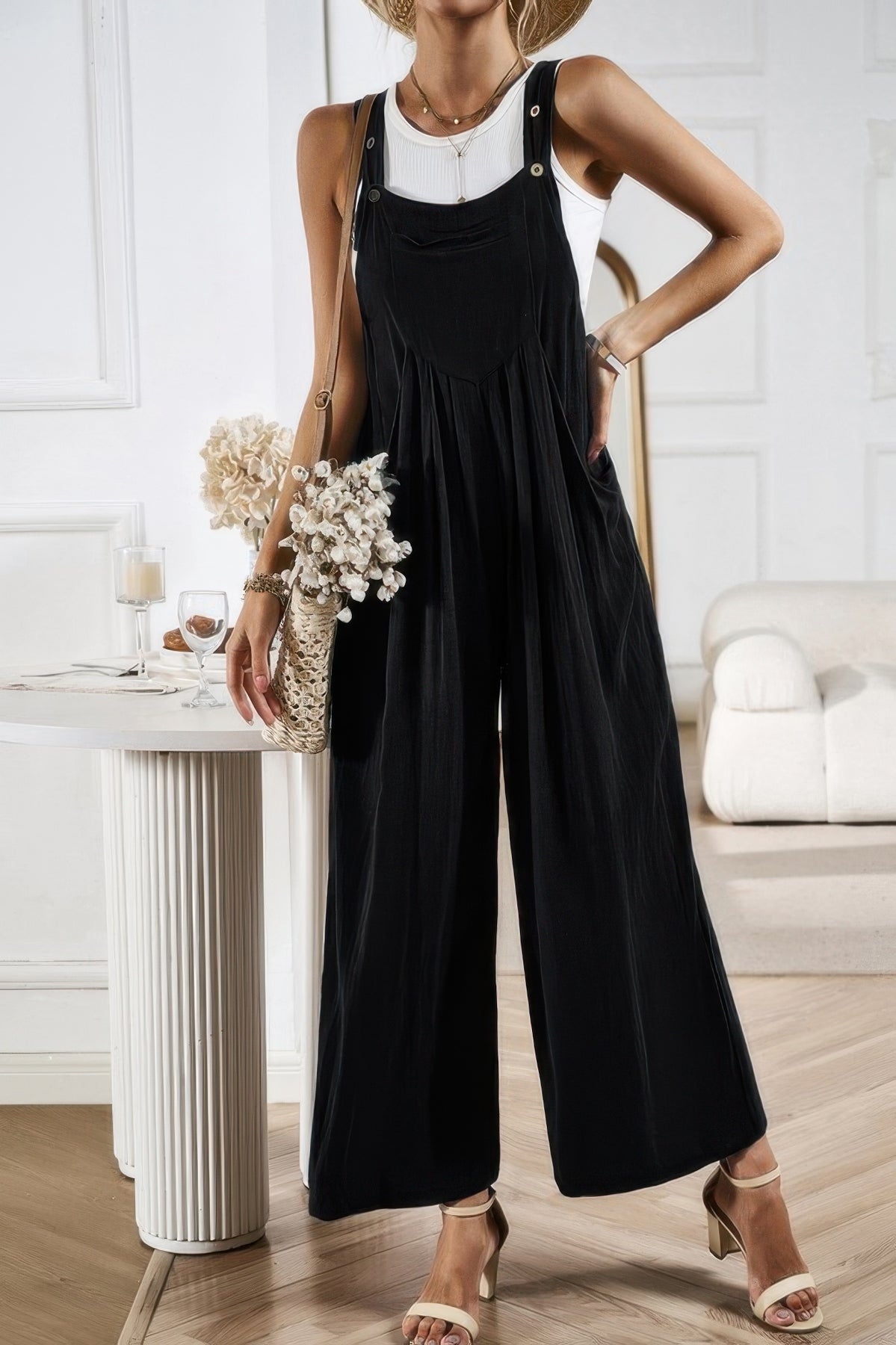 Button Detail Wide Leg Overall Pockets Jumpsuit